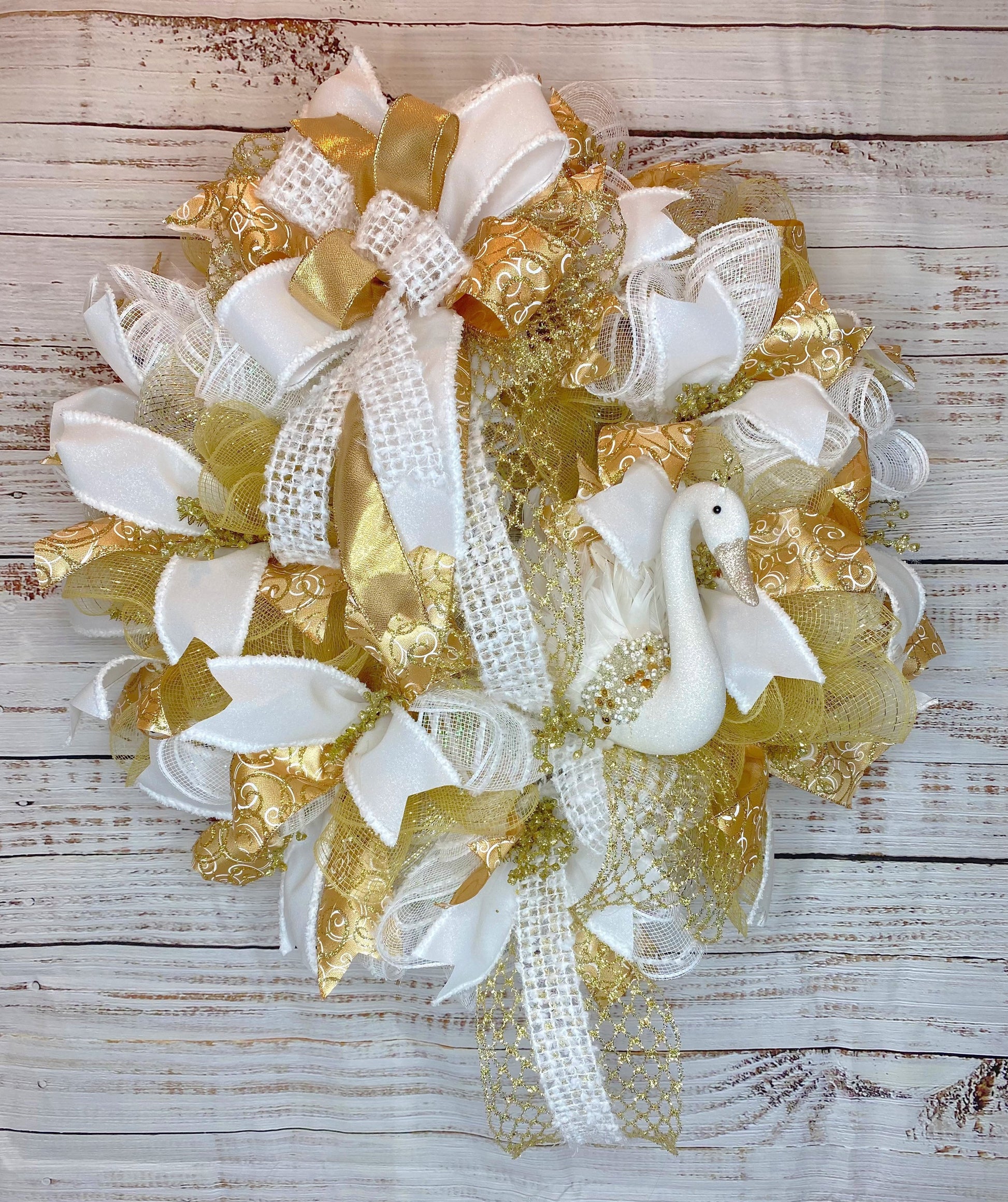Elevate your holiday décor with this stunning white and gold swan wreath, a sophisticated statement piece that brings elegance to any space. Handcrafted with a sturdy wire frame, luxurious wired ribbon, decorative mesh, shimmering gold picks, and a graceful swan centerpiece, this wreath radiates timeless charm. Measuring 27x32x12 inches, it commands attention as a focal point above fireplaces, in entryways, or across living room walls. The abundant sparkle and refined design make it an exceptional gift or personal indulgence. For optimal longevity, display under covered areas like porches or overhangs to protect from direct weather exposure. Perfect for those seeking upscale holiday styling with enduring appeal.