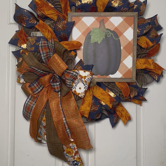 This handcrafted mesh wreath combines rich blue, vibrant orange, and warm copper tones to create a striking seasonal accent. Measuring 24 inches wide, 29 inches long, and 9.5 inches deep, its generous size adds depth and dimension to any doorway or wall. The included pumpkin sign, crafted from durable MDF material, complements the autumnal color palette perfectly. Ideal for elevating your fall décor with expert craftsmanship and lasting quality.