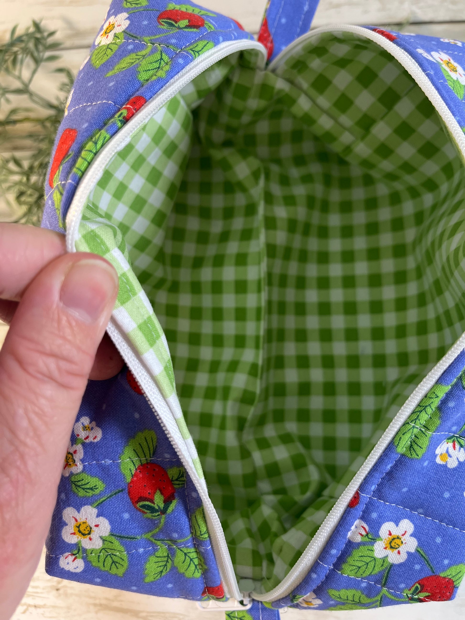 Handmade Boxy Makeup Bags | Quilted Cotton Cosmetic Pouch | Blue Floral, Strawberry, and Paw Prints | Travel Toiletry Organizer | Gift for Her