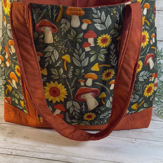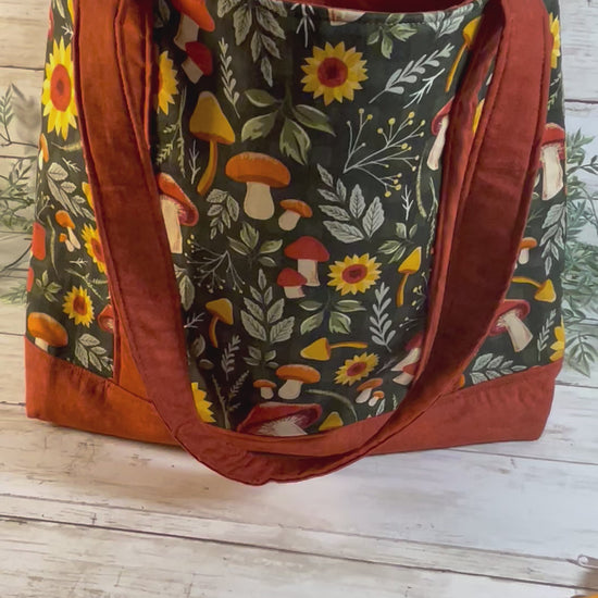 Carry a touch of cozy woodland charm wherever you go with this handmade cotton tote bag featuring a delightful mix of mushrooms, sunflowers, and fall foliage. Perfect for autumn lovers, this roomy tote is crafted from 100% cotton fabric with a deep rust-orange accent base and handles that complement the warm, earthy tones of the print.