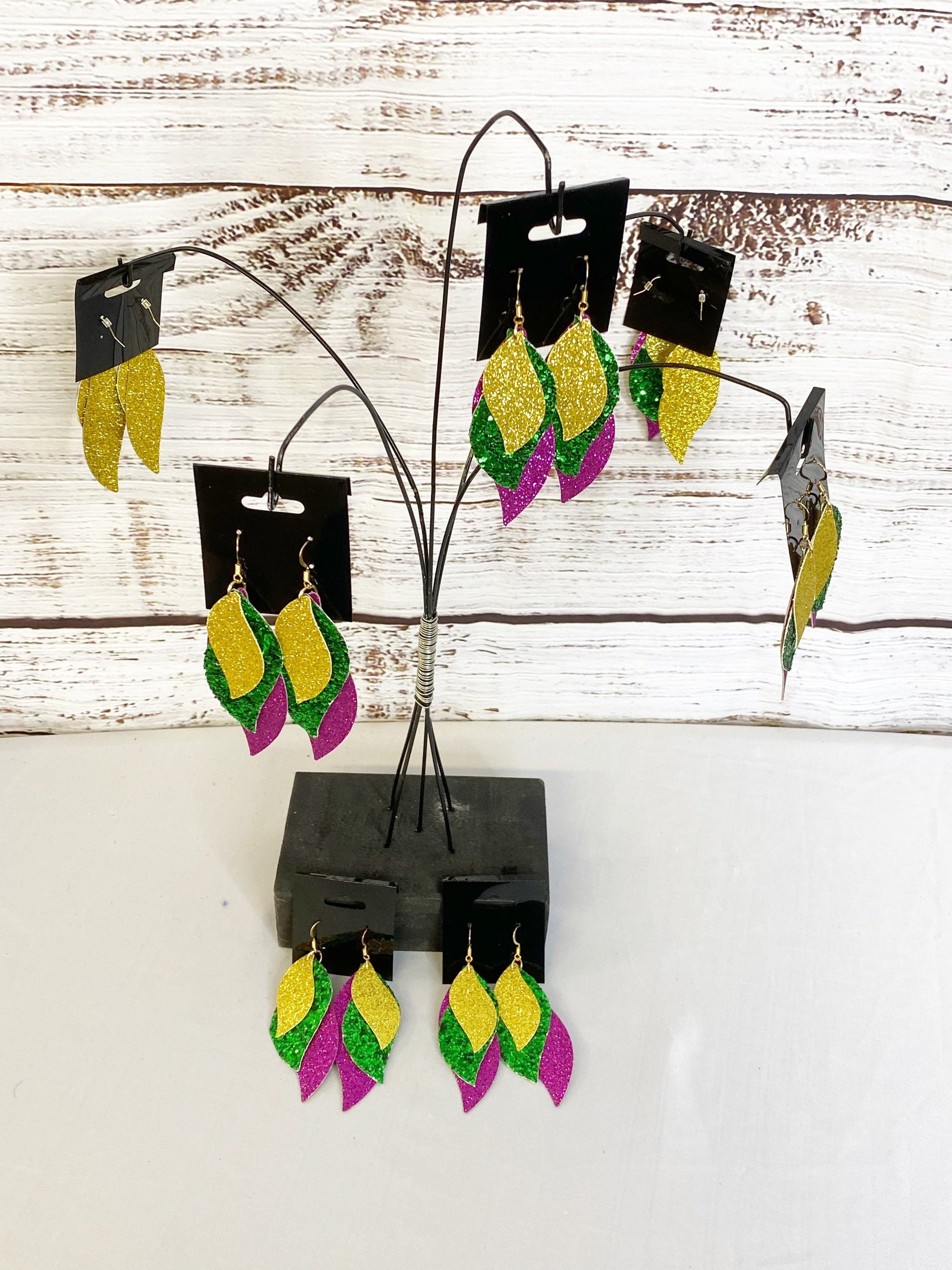 Mardi Gras Faux Leather Dangle Earrings: Purple, Gold, and Green