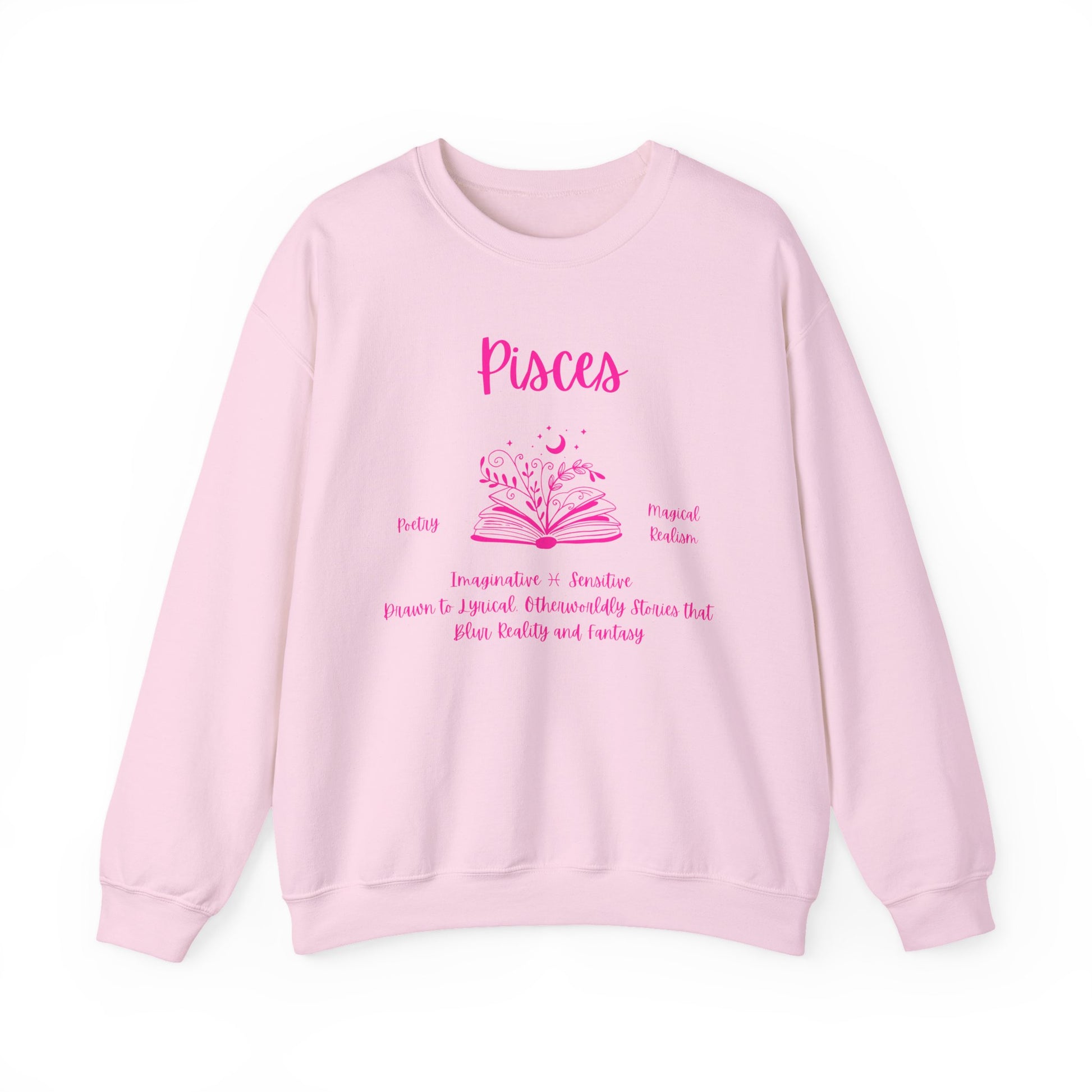 Dreamy, intuitive, and imaginative—Pisces readers live in the world of stories. This Pisces Book Lover Sweatshirt features a bold pink design on your choice of white, black or light pink, blending coziness with zodiac charm.