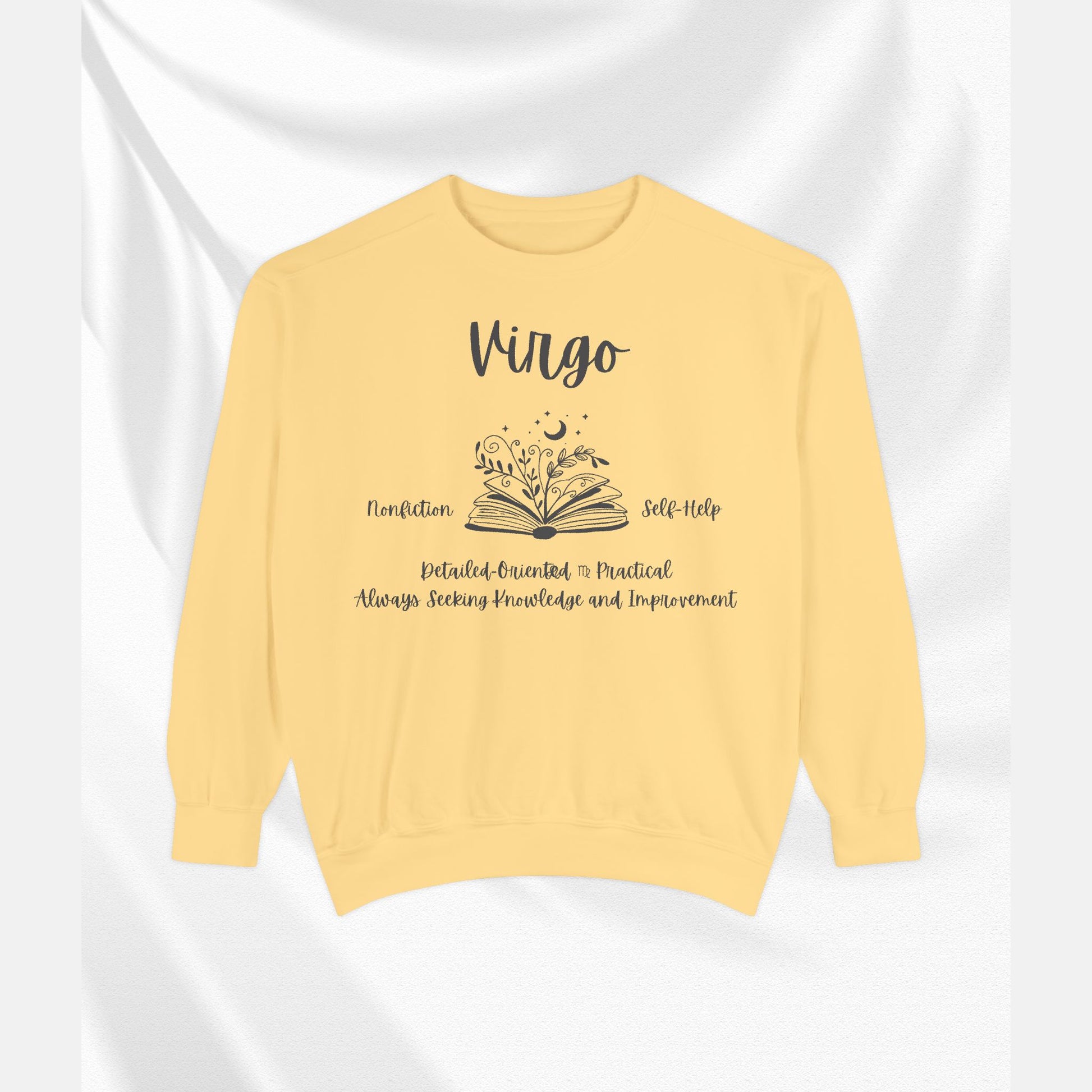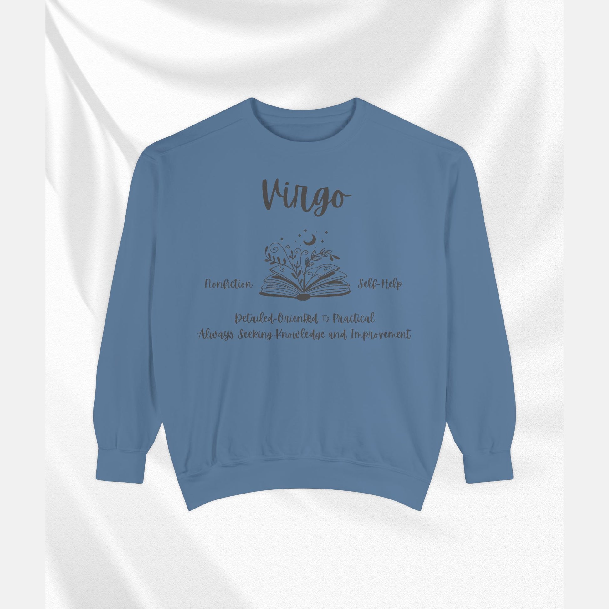 Virgo zodiac book lover sweatshirt that is perfect for cozy nights spent reading or lounging around. This sweatshirt exudes a relaxed and comfortable vibe, making it ideal for those who enjoy a laid-back style. The design is relevant for Virgo zodiac enthusiasts who love books and reading. Perfect for fall and winter seasons, as well as birthdays or holidays for bookworms.
